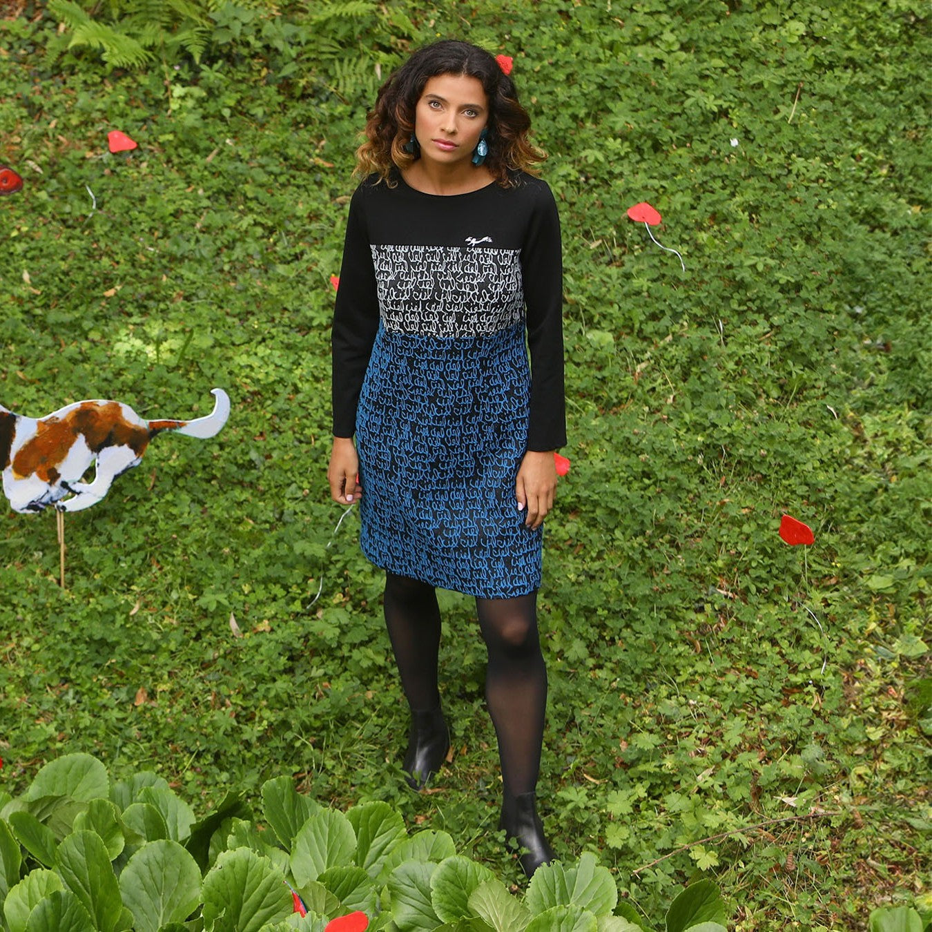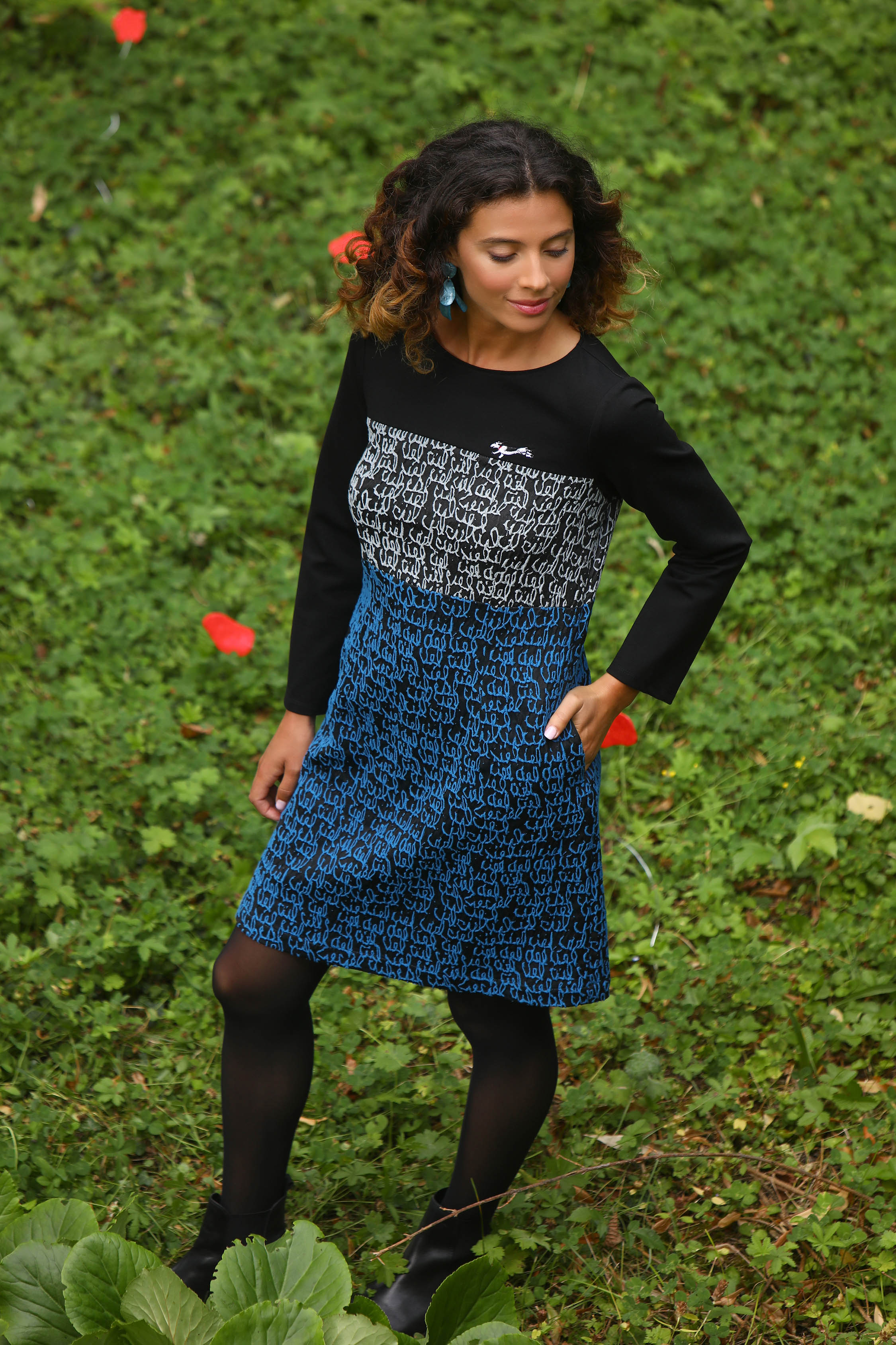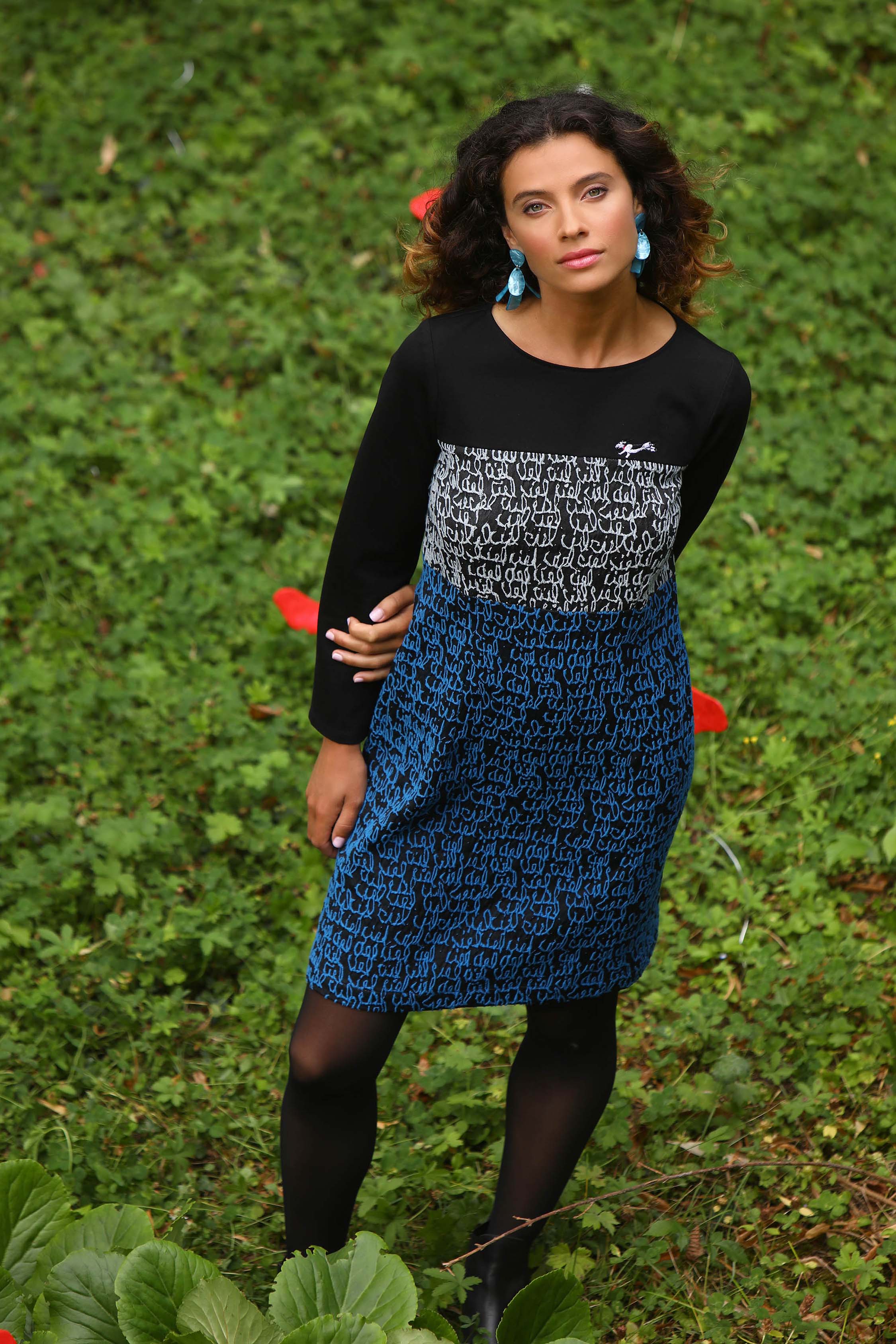 - Une robe réalisée en 3 matières dont deux en jacquard et une en maille dense et confortable
