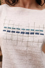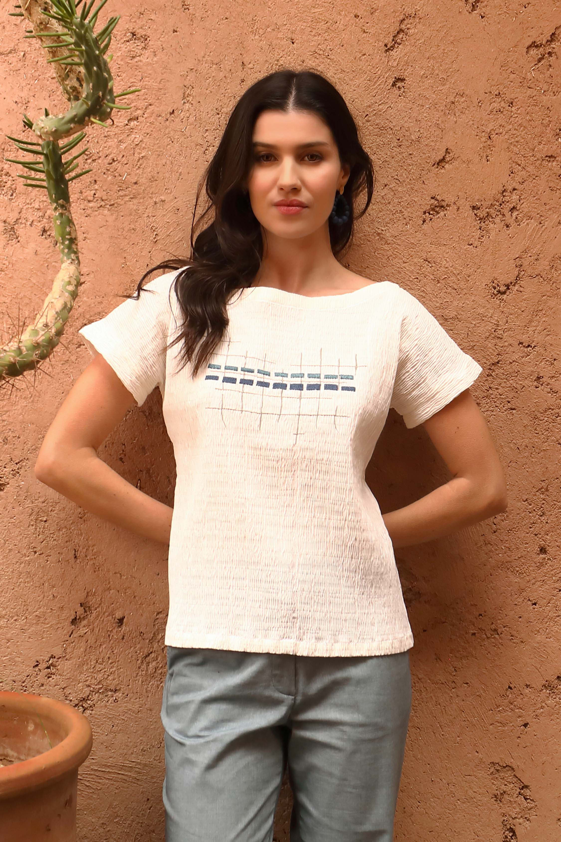 Top brodé en tissu original, alliant relief textile, confort et élégance estivale.